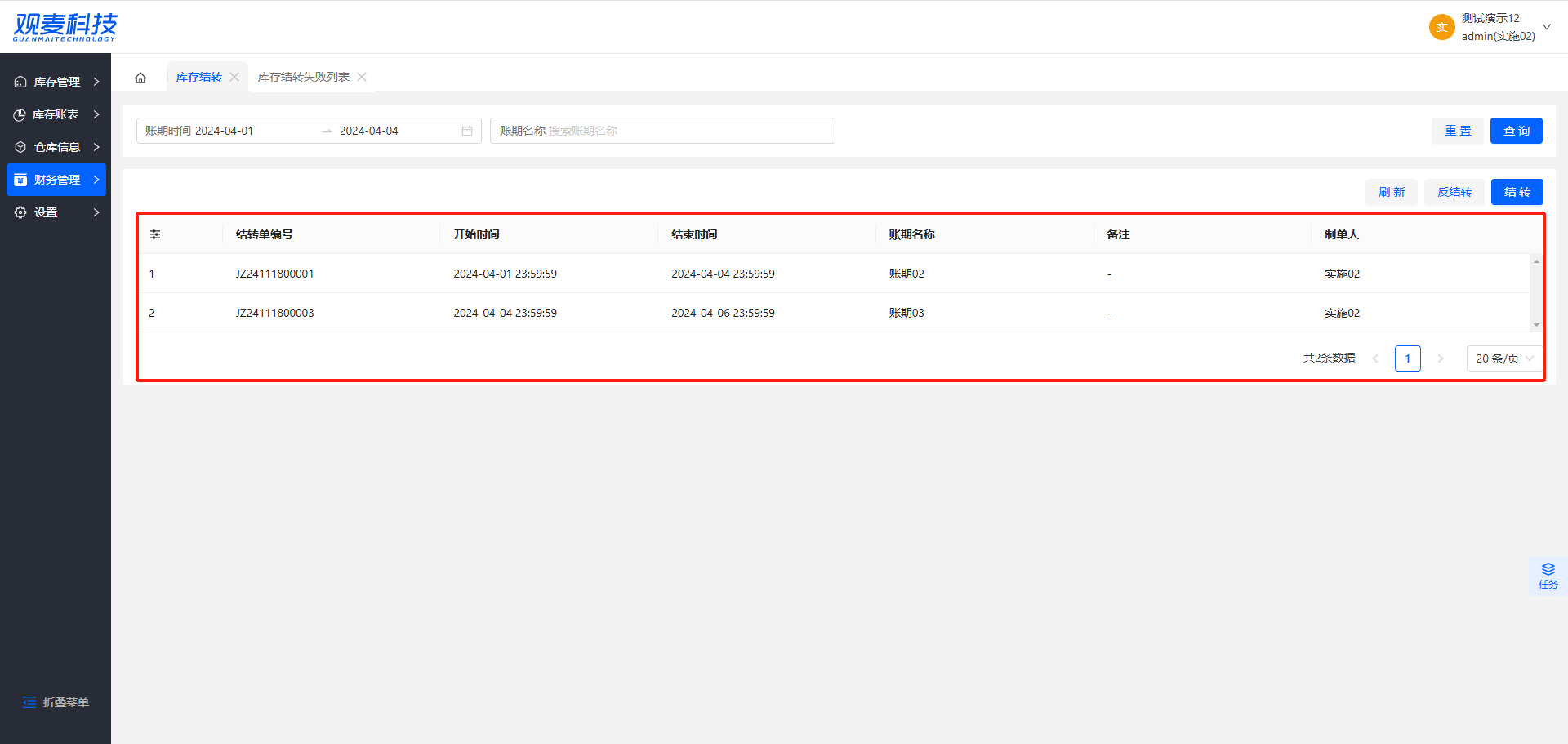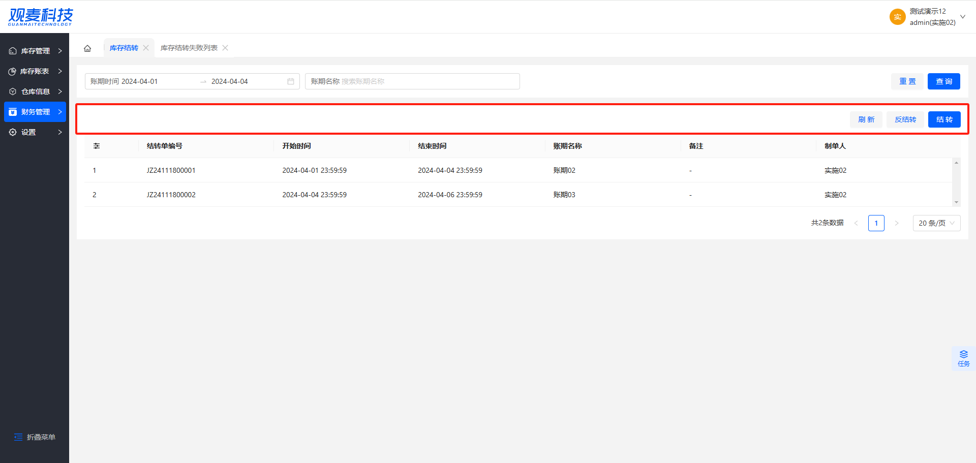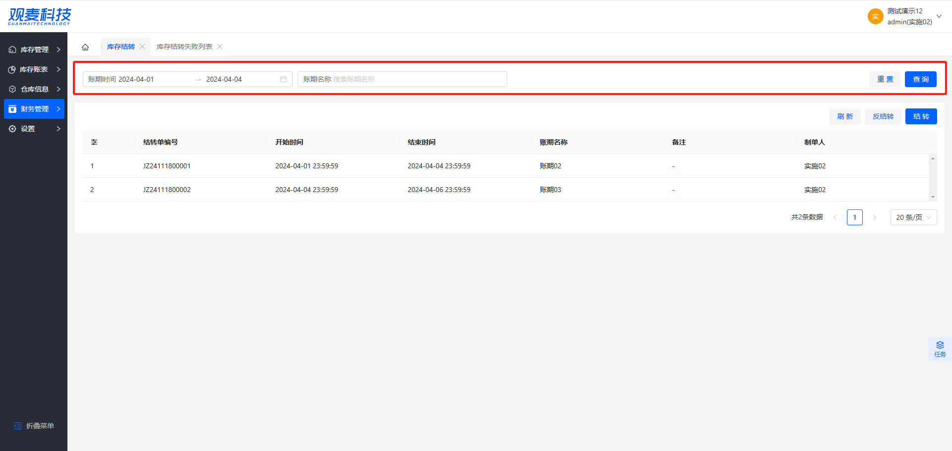 - 反结转:作废并删除最近一次的结转单据,同时解除对该账期内出入库单据的锁定限制