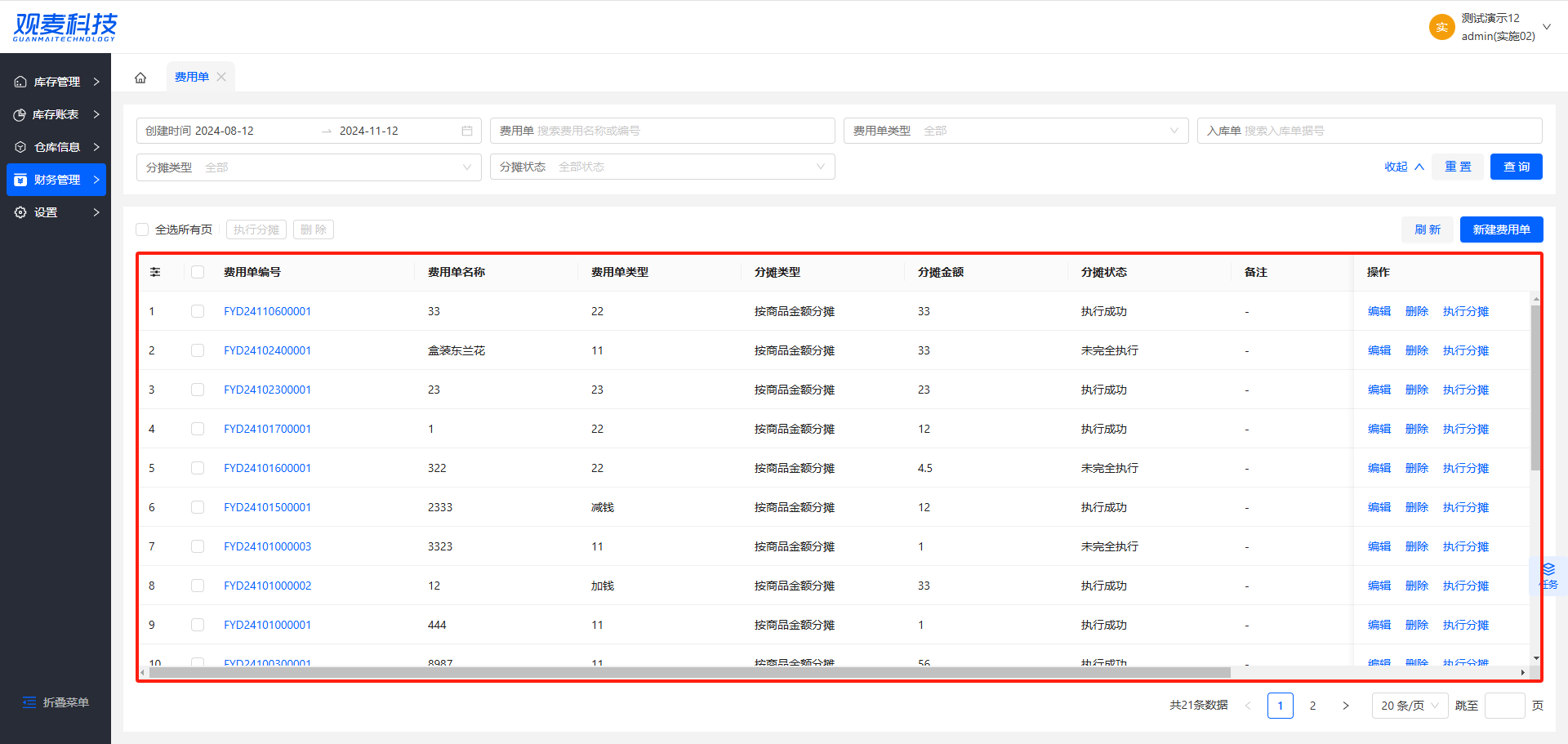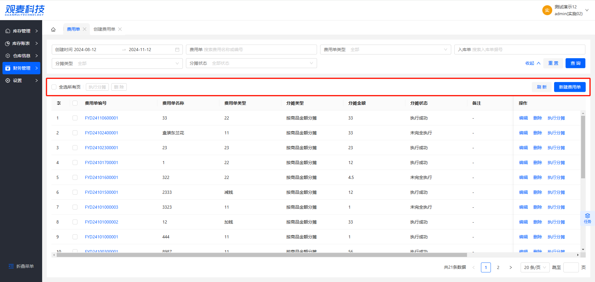 - 执行分摊:在采购入库单中已创建未分摊的费用单可在此进行批量手动分摊