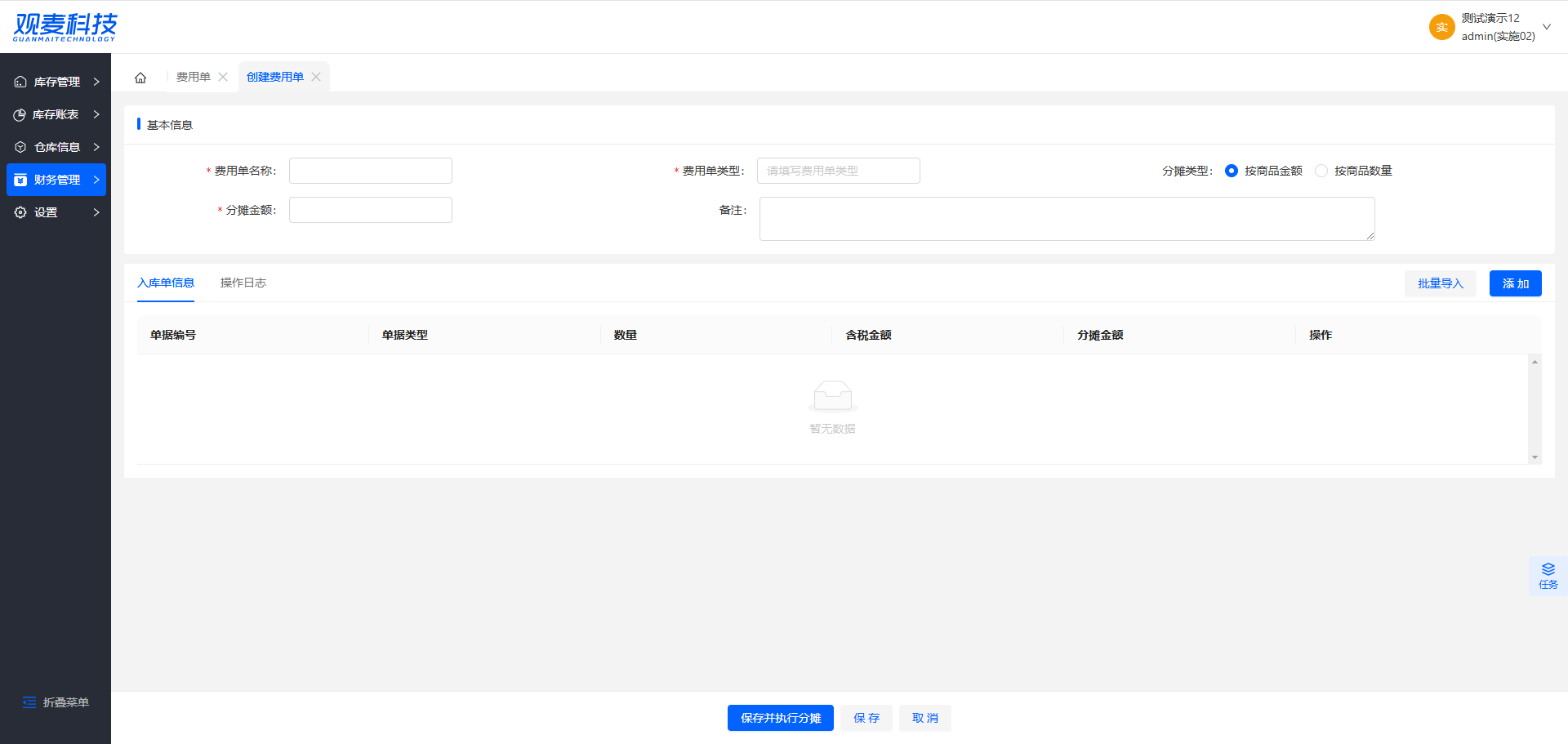 - 新建费用单:手动新建费用单,点击后进入新建费用单页面,填写费用单基础信息、分摊金额、选择分摊类型后同时关联入库单据即可完成费用单的创建