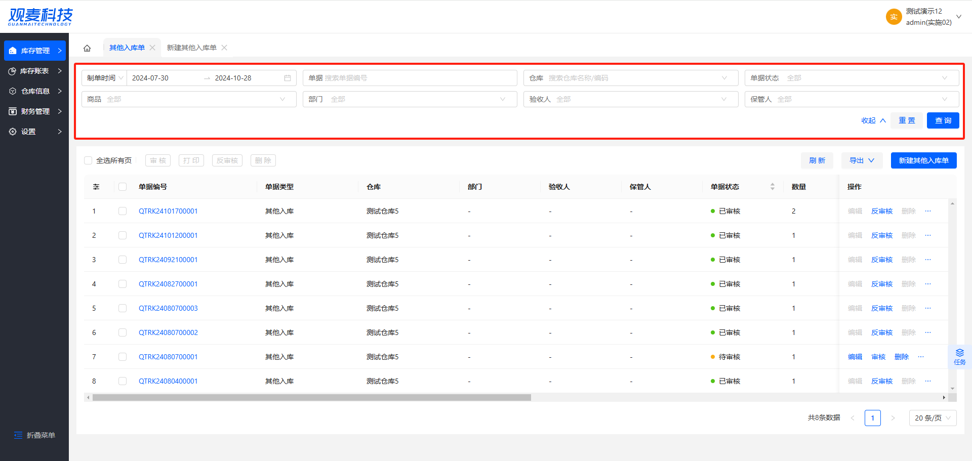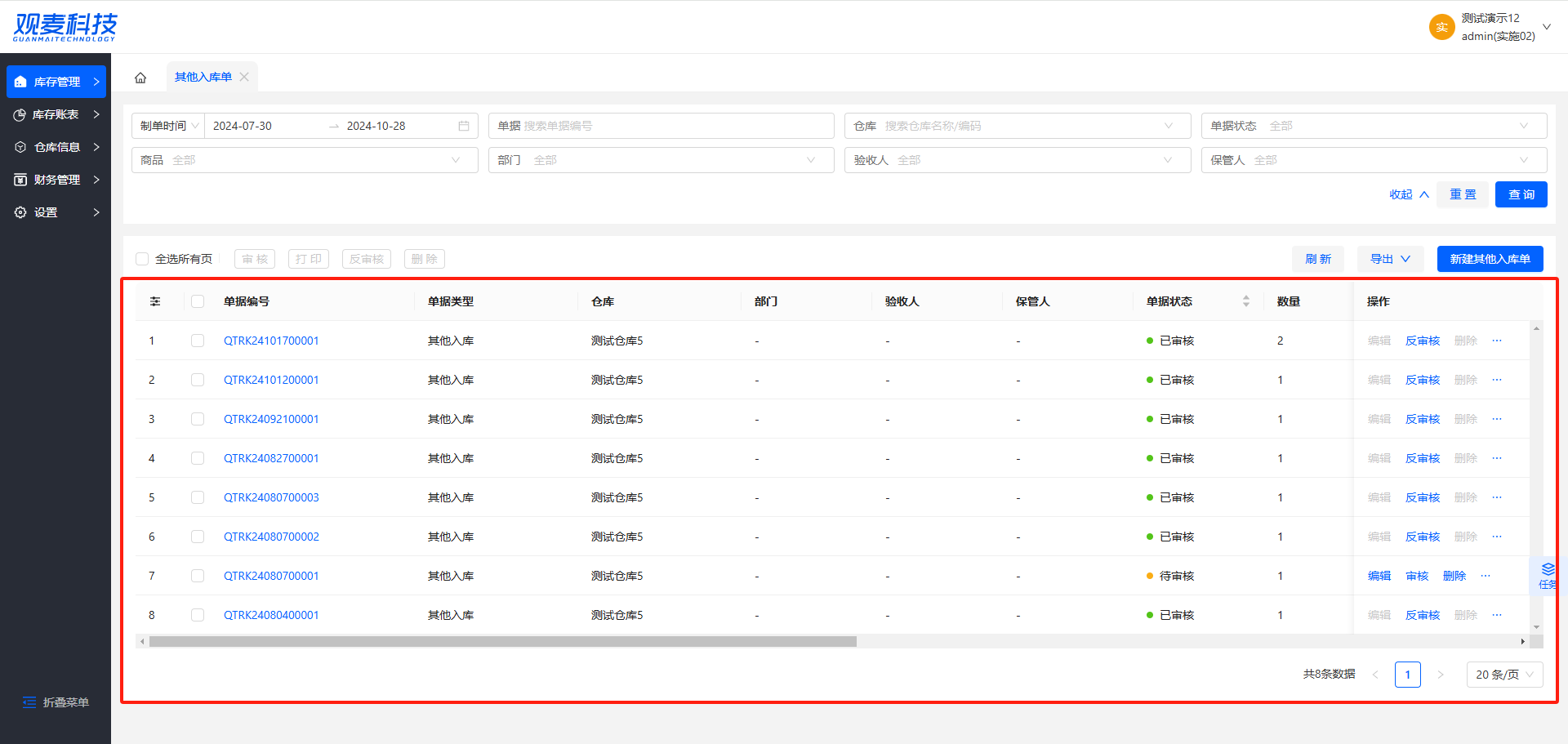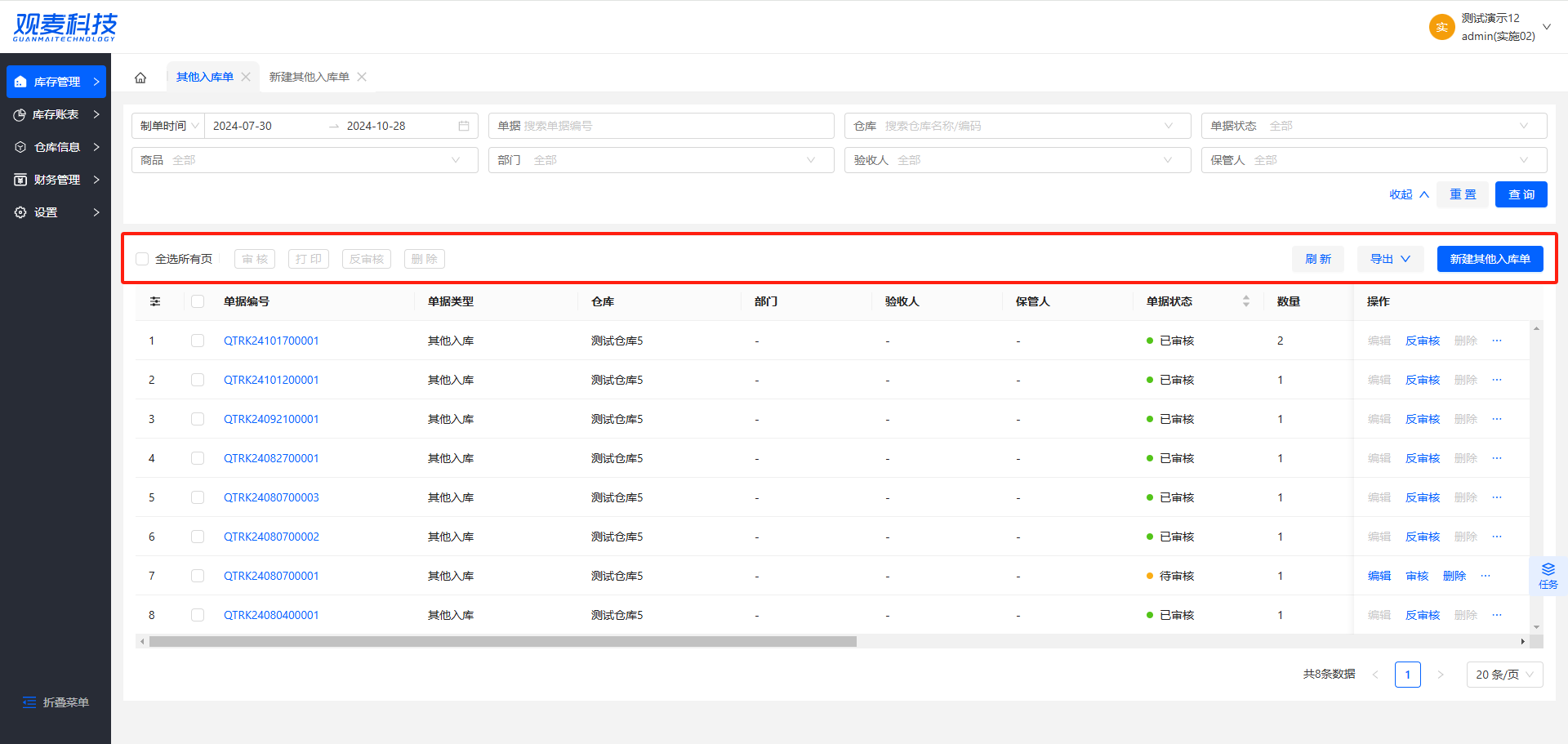 - 审核:手工新建其他入库后将生成一条状态为「待审核」数据,勾选其他入库单据后可进行批量审核,成功审核后完成入库动作