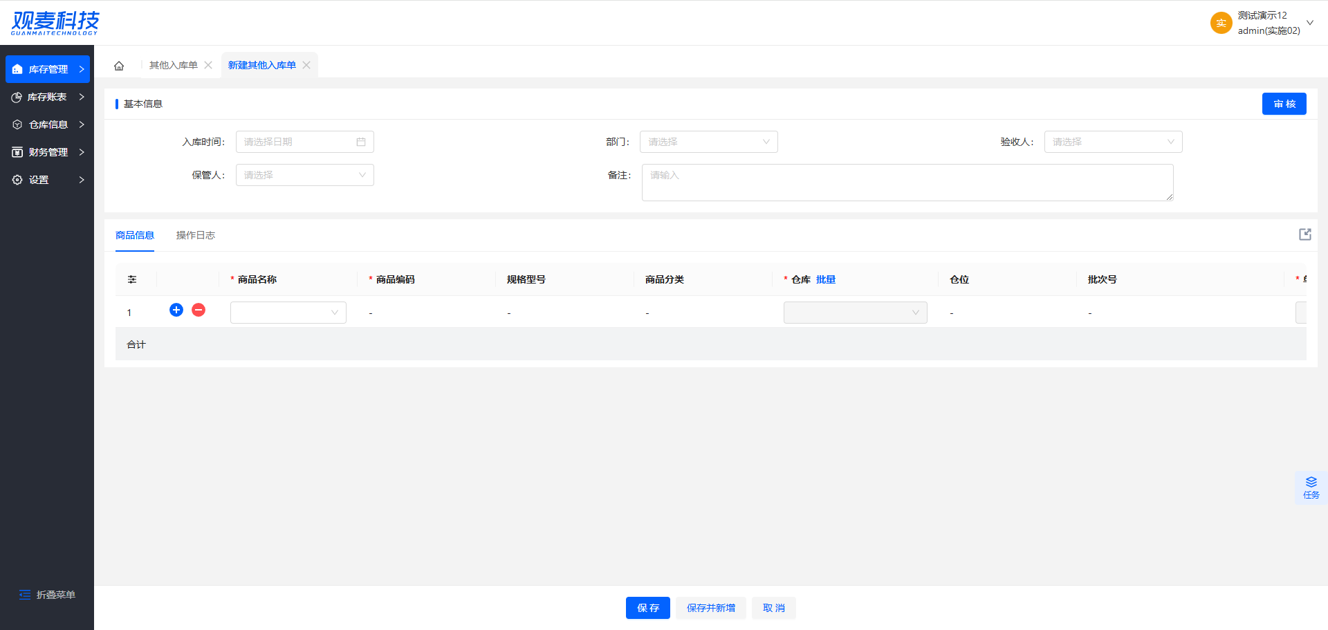 - 新建其他入库单:手动新建其他入库单,点击后进入【新建其他入库单】页面,进行基本信息和商品信息的填写,完成填写后保存并新增即可新增其他入库单据