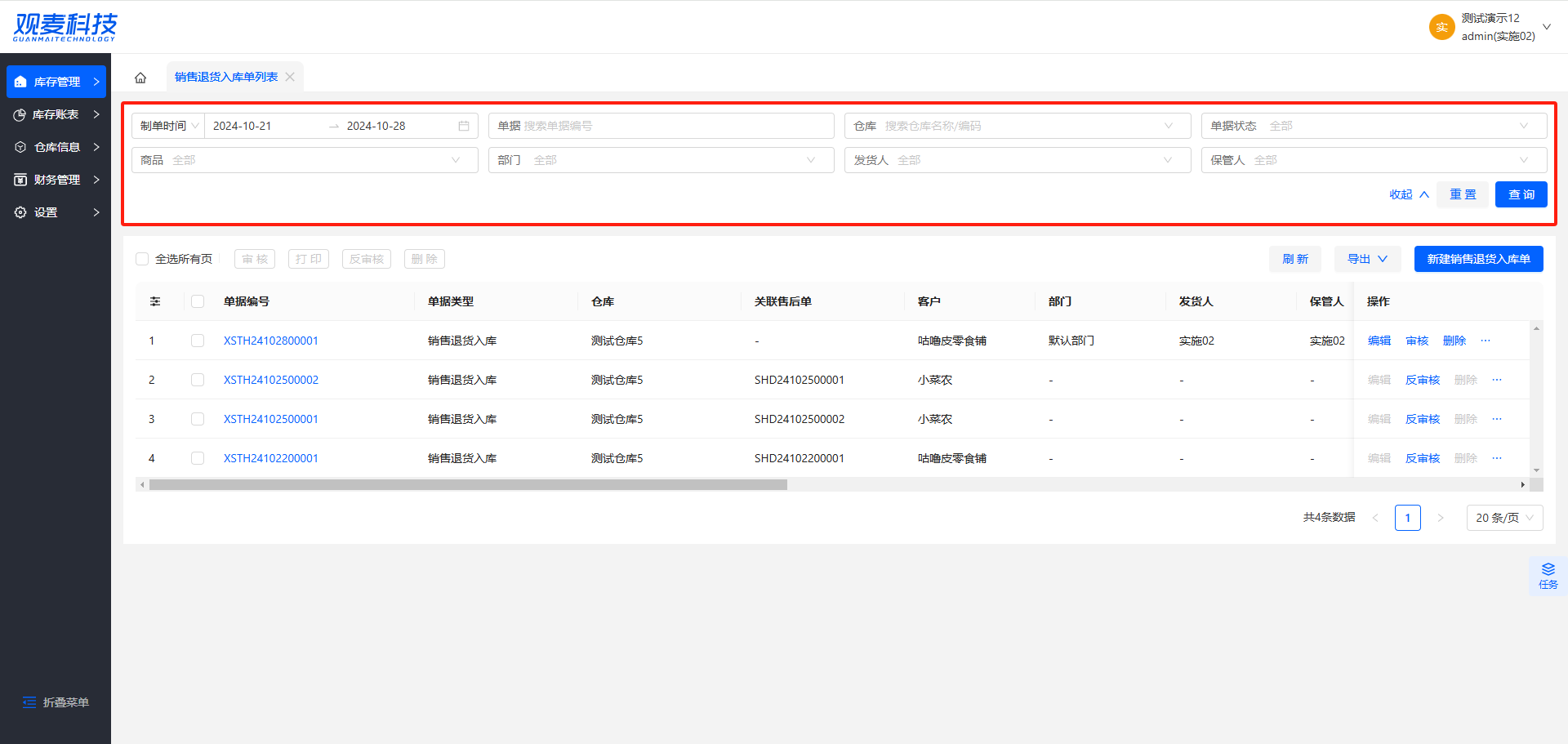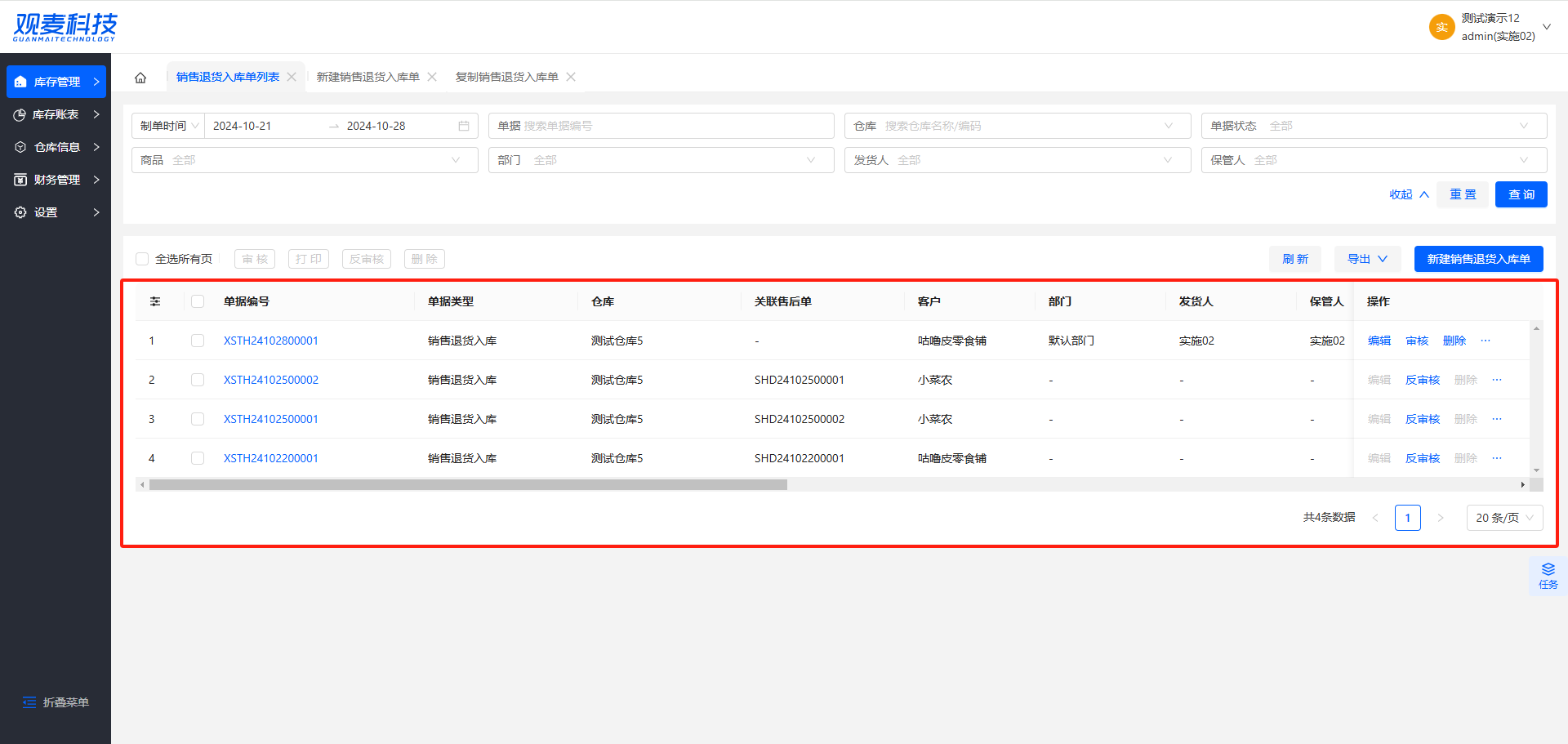 - 反审核:可对已审核的销售退货入库单进行反审核