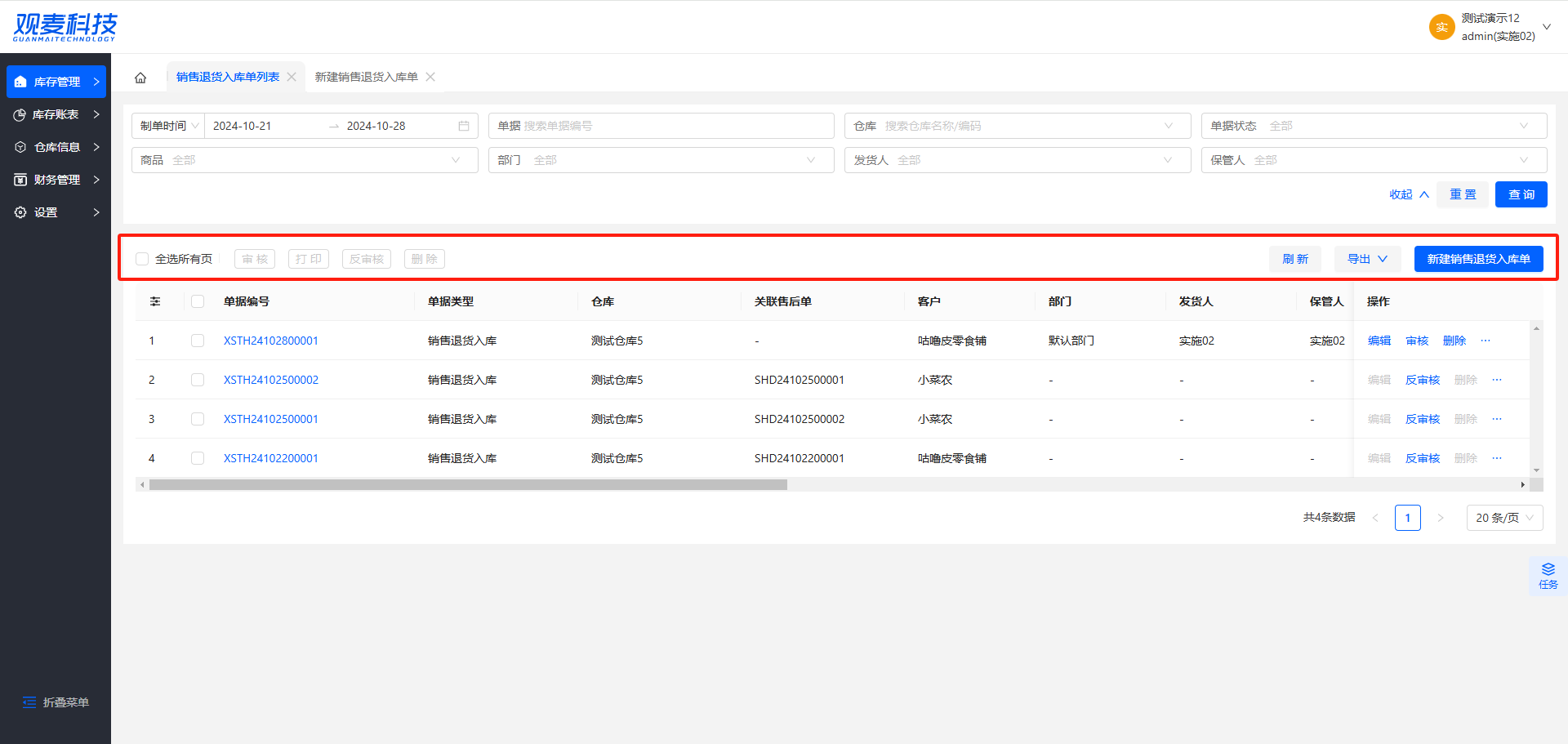 - 删除:可删除「待审核」状态下的销售退货入库单据