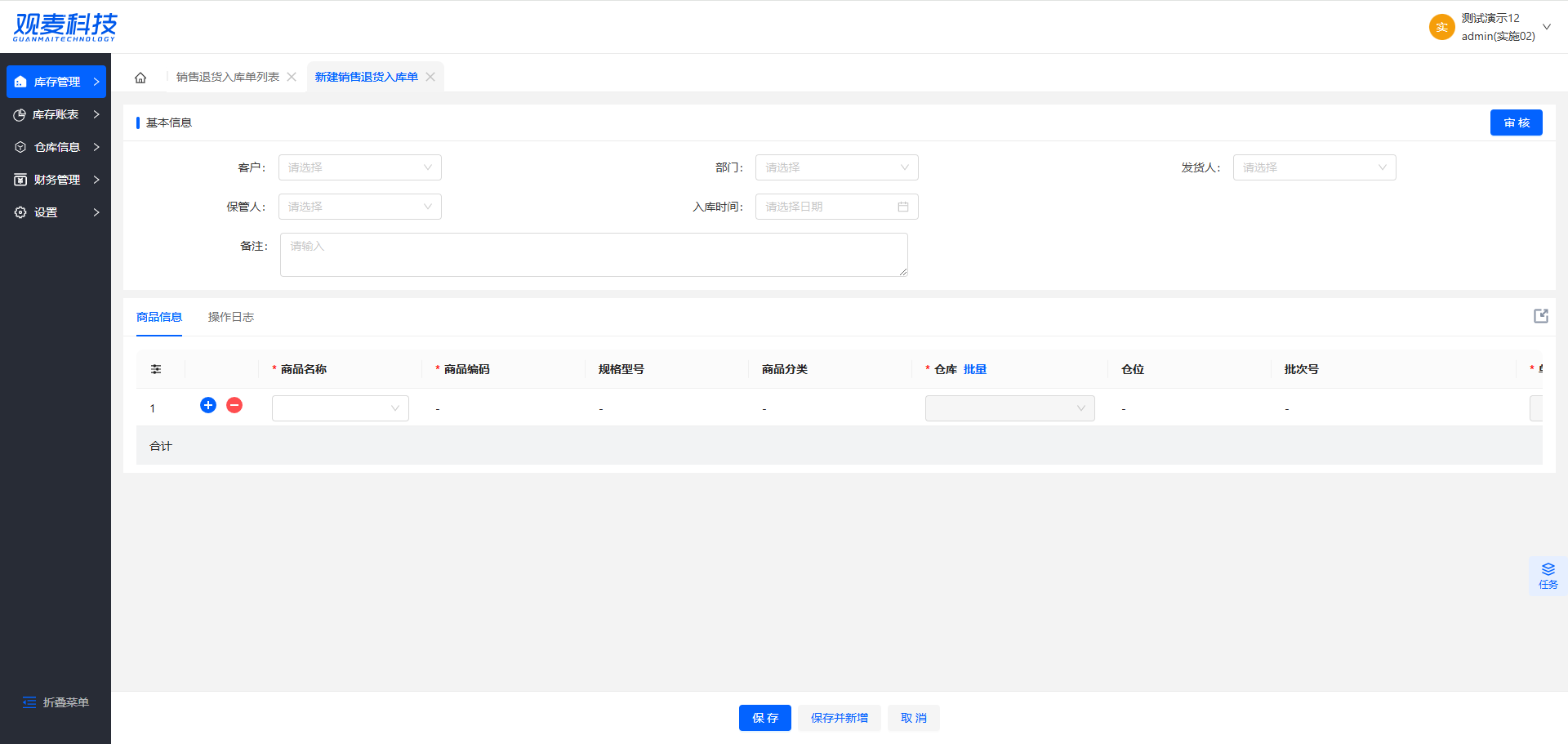 - 新建销售退货入库单:手动新建销售退货入库单,点击后进入【新建销售退货入库单】页面,进行基本信息和商品信息的填写,完成填写后保存并新增即可新增销售退货入库单据