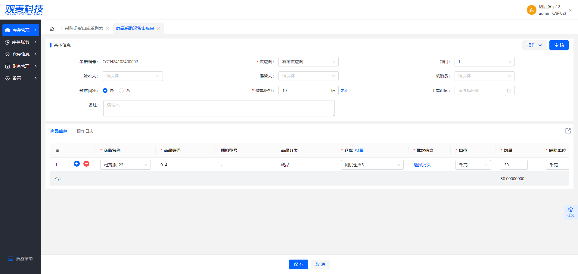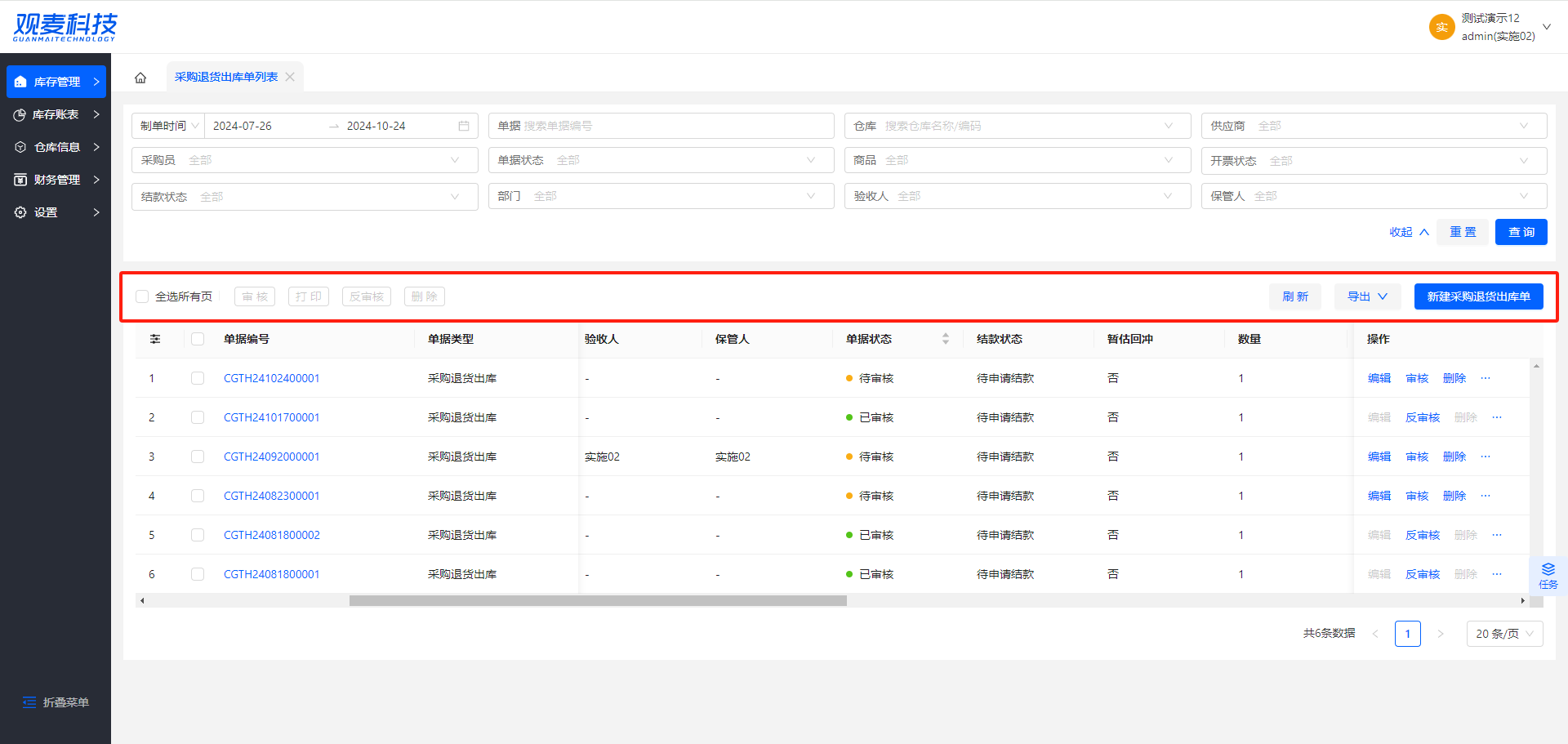 - 删除:可删除「待审核」状态下的采购退货出库单据