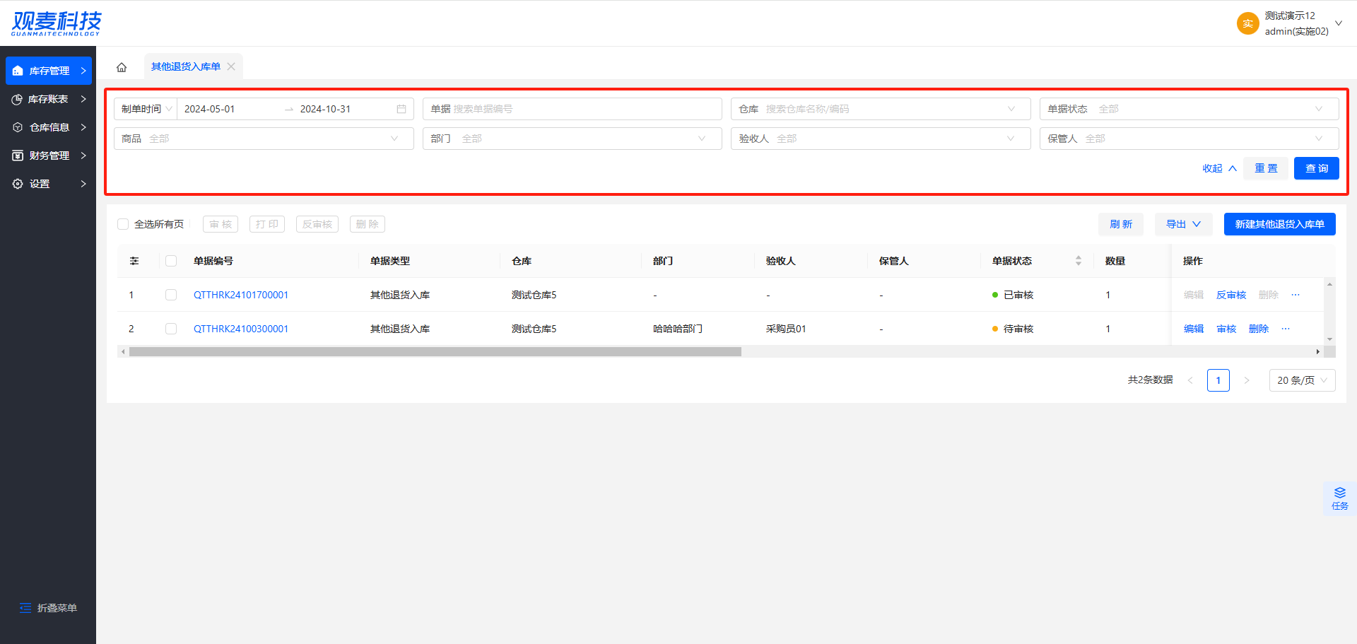 - 反审核:可对已审核的其他退货入库单进行反审核