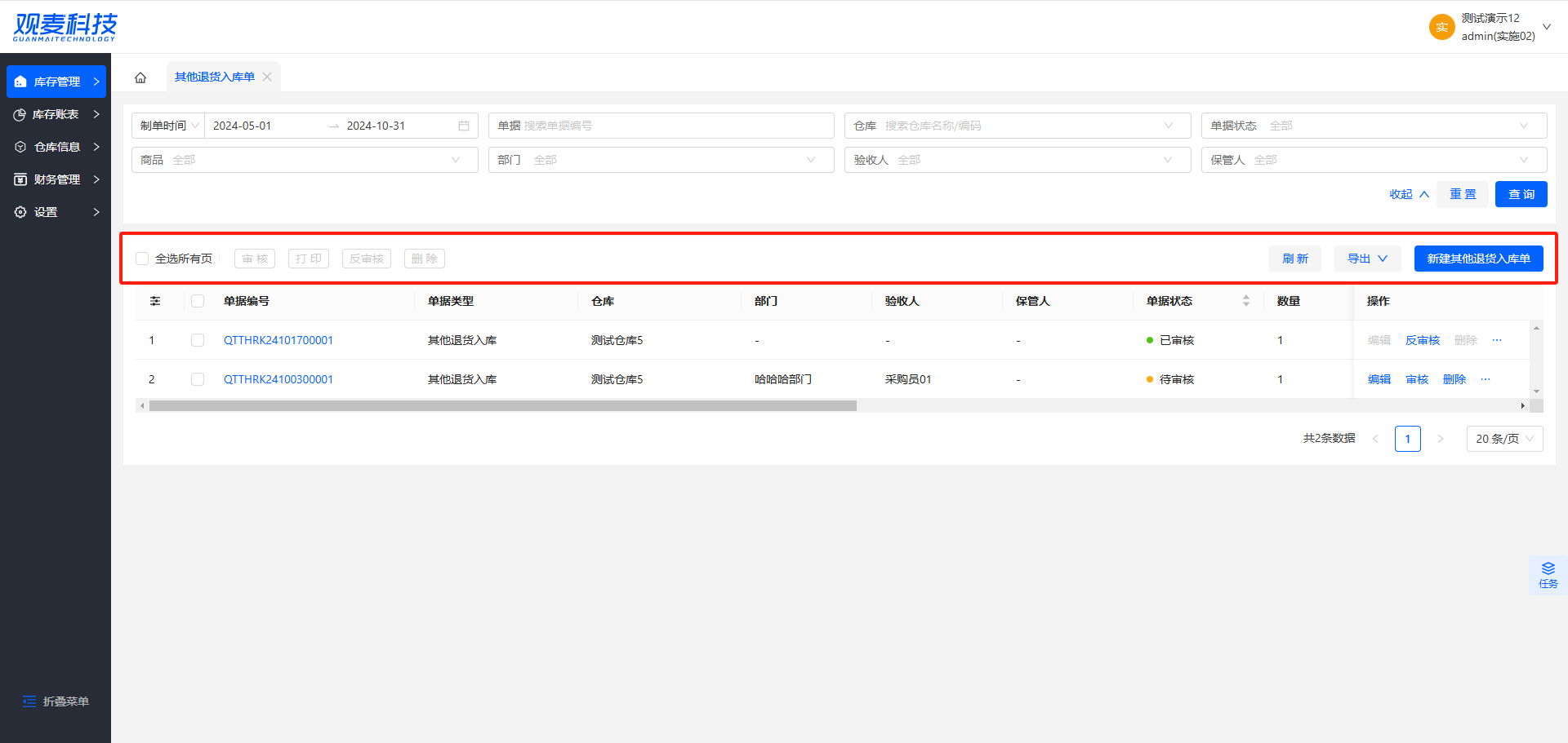 - 审核:手工新建其他退货入库后将生成一条状态为「待审核」数据,勾选其他退货入库单据后可进行批量审核,成功审核后完成入库动作
