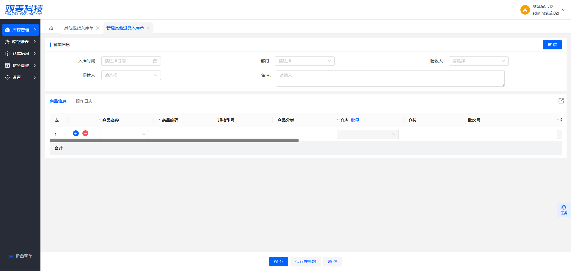 - 新建其他退货入库单:手动新建其他退货入库单,点击后进入【新建其他退货入库单】页面,进行基本信息和商品信息的填写,完成填写后保存并新增即可新增单据