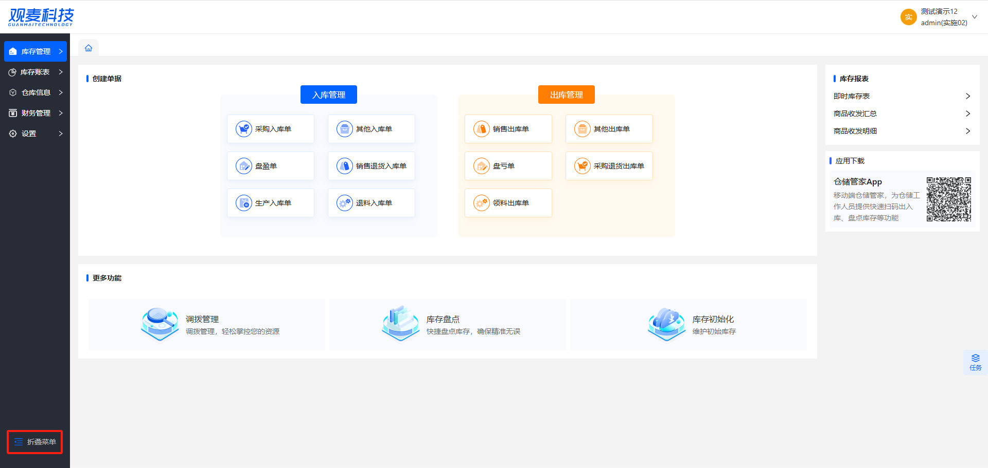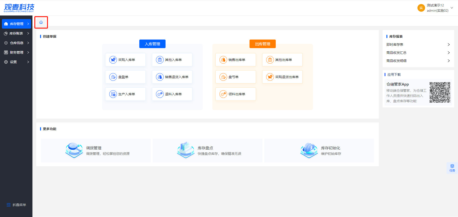 首页共划分为四个主要模块,分别是创建单据、更多功能、库存报表以及应用下载。分别对应入库/出库单据的快速创建、调拨管理/库存盘点/库存初始化操作、库存相关报表的快速查看以及应用下载二维码展示。此外,在其他页面间浏览时也可点击顶部导航左侧按钮进入。