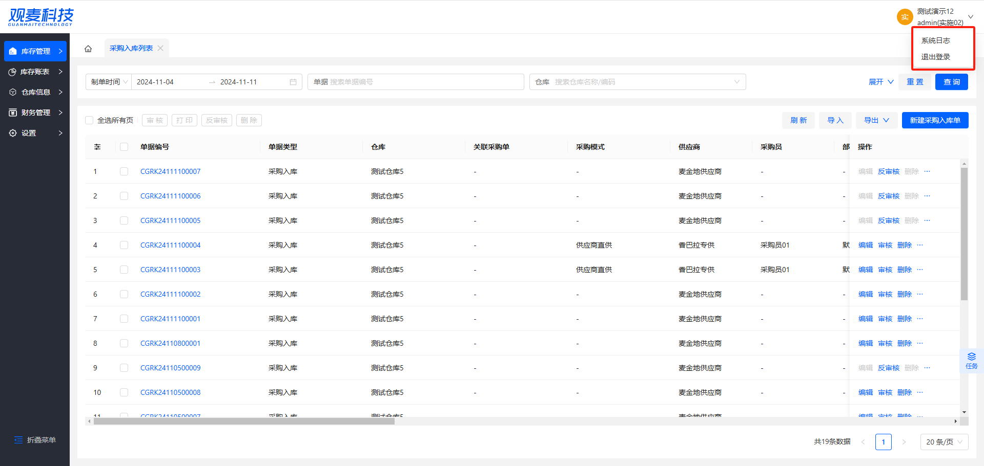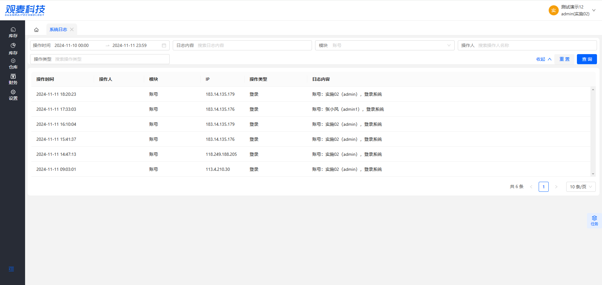 光标在页面右上角停留时将出现“系统日志”和“退出登录”选项,点击“系统日志”可进入系统日志界面按照顶部筛选项进行操作日志查询浏览;