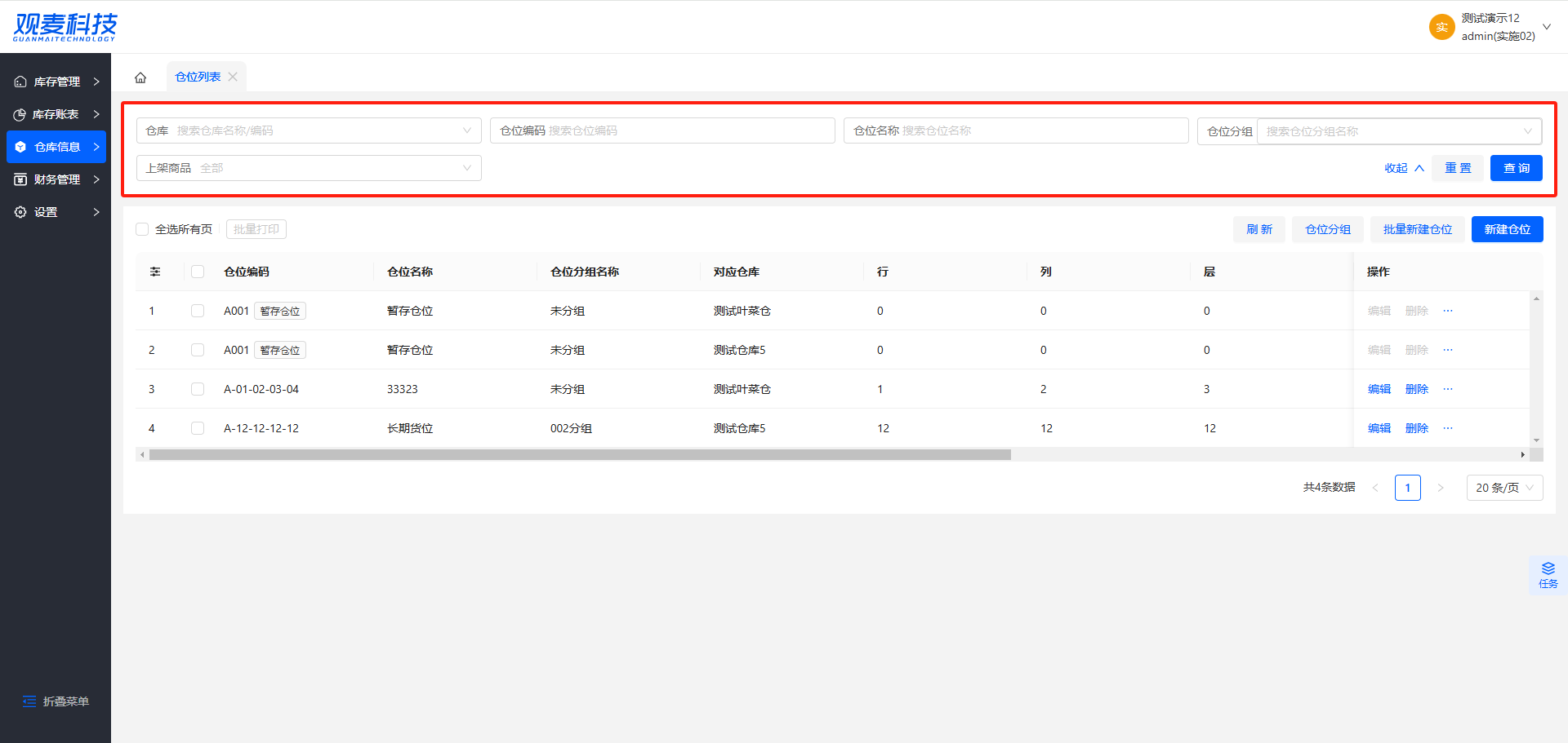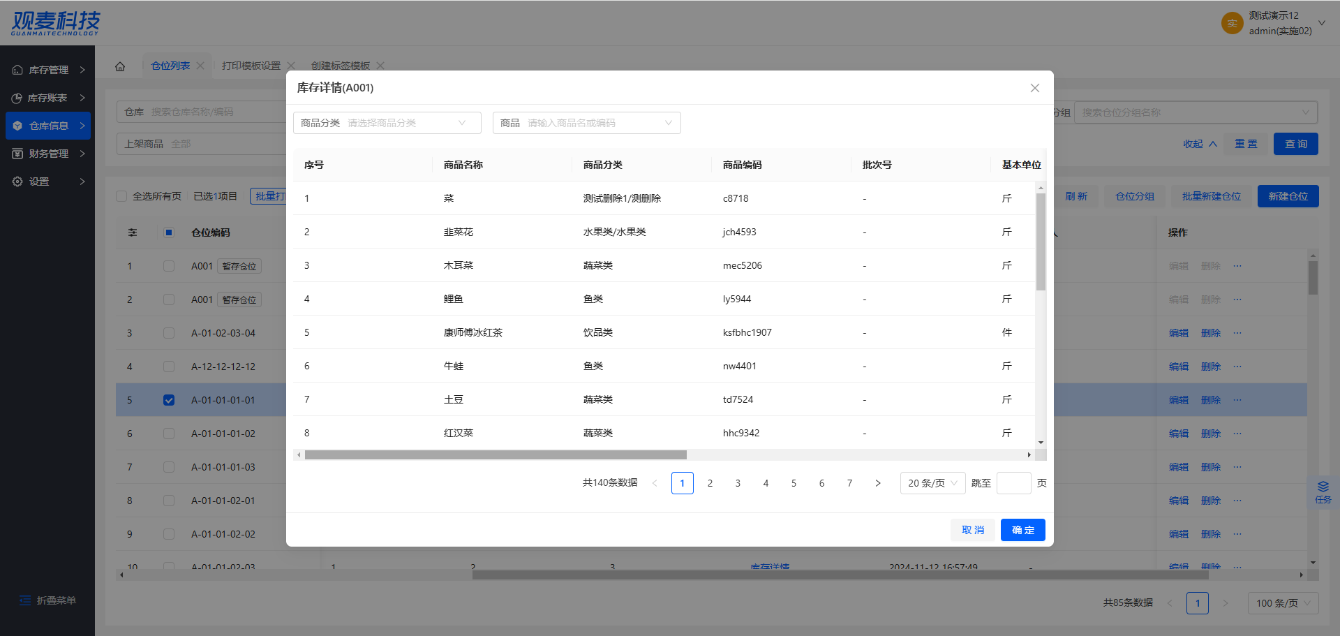 3、仓位列表中可查看仓位详细信息,其中可点击列表内仓位数据的 库存详情 按钮查看仓位对应库存。列表的右侧为操作栏,