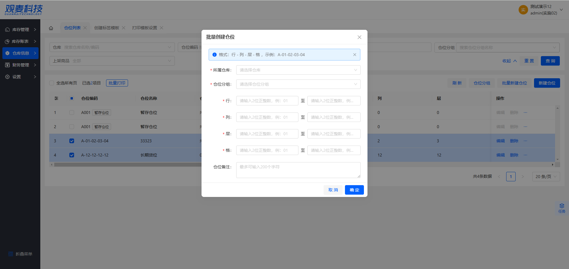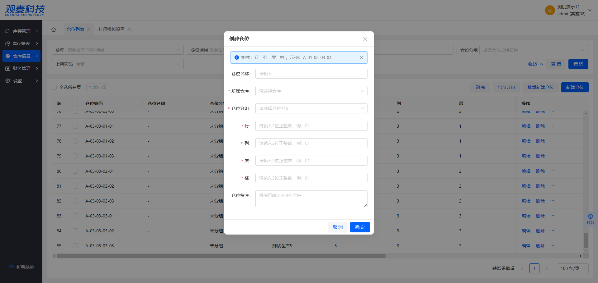 - 新建仓位:手动新建仓位,点击后弹出新建仓位弹窗,分别填写仓位行、列、层和格即可完成仓位创建