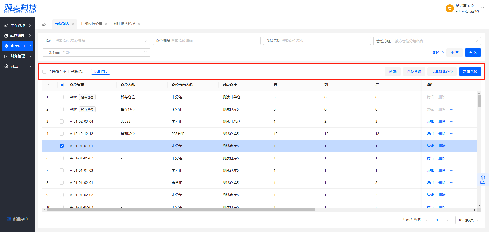 在仓位列表中,你可以将现有仓库的仓位录入并在系统中进行维护,对于已录入的仓位可以在列表中查询仓位详细信息,同时在已创建仓位的基础上可以在出入库流程中完成对商品进行上/下架操作。