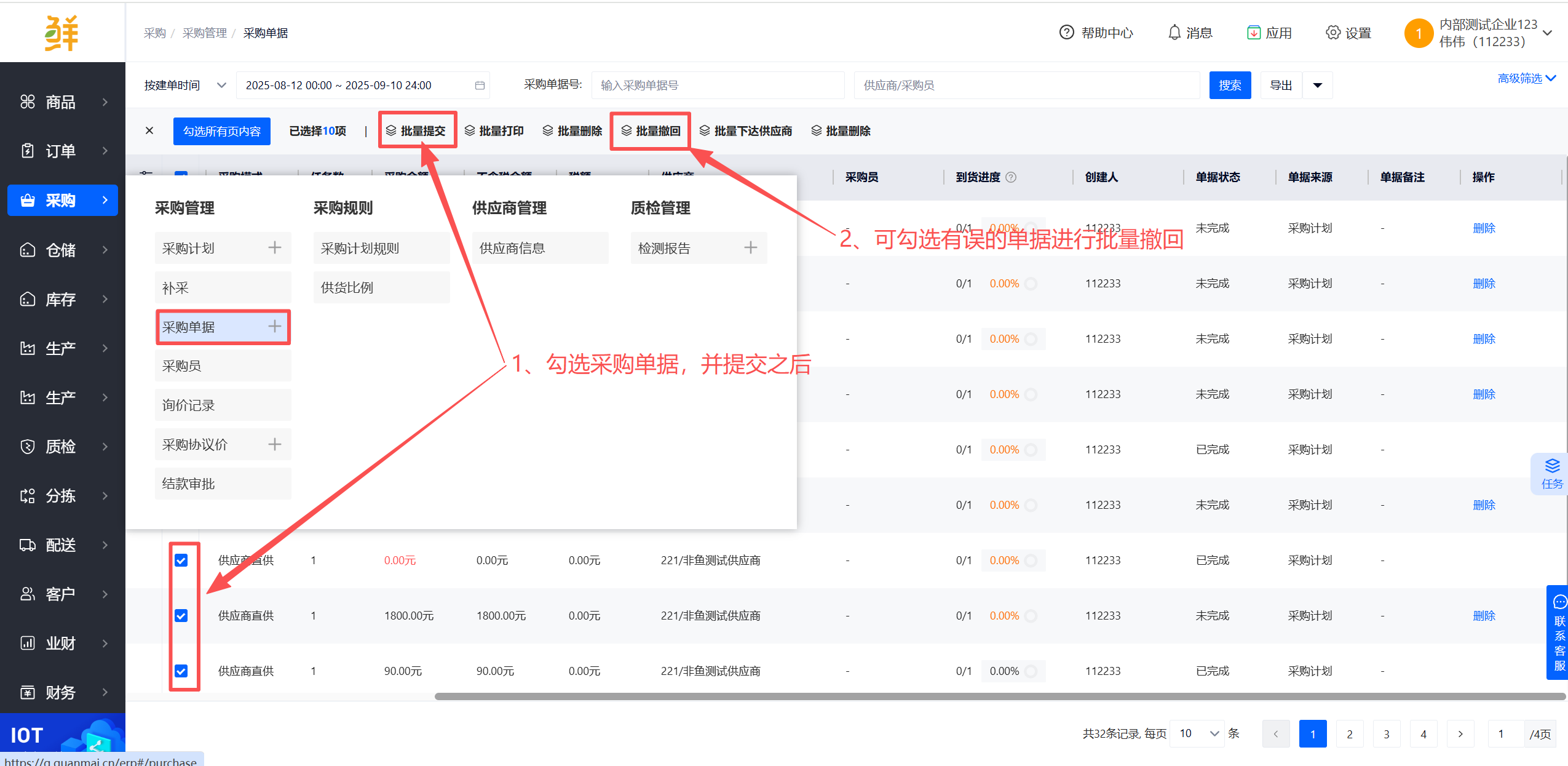 采购单据提交之后,客户发现单据有误,支持批量撤回,避免造成损失