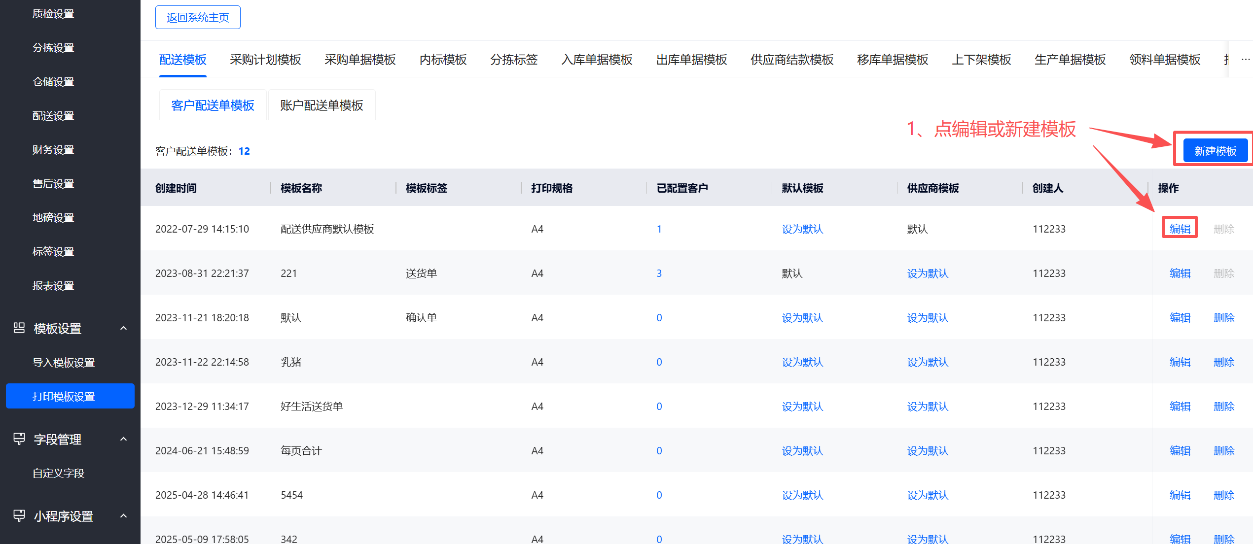 1、【ERP】设置->模板设置->打印模板设置->配送单模板->客户配送单模板,编辑或新建模板,设置配置项