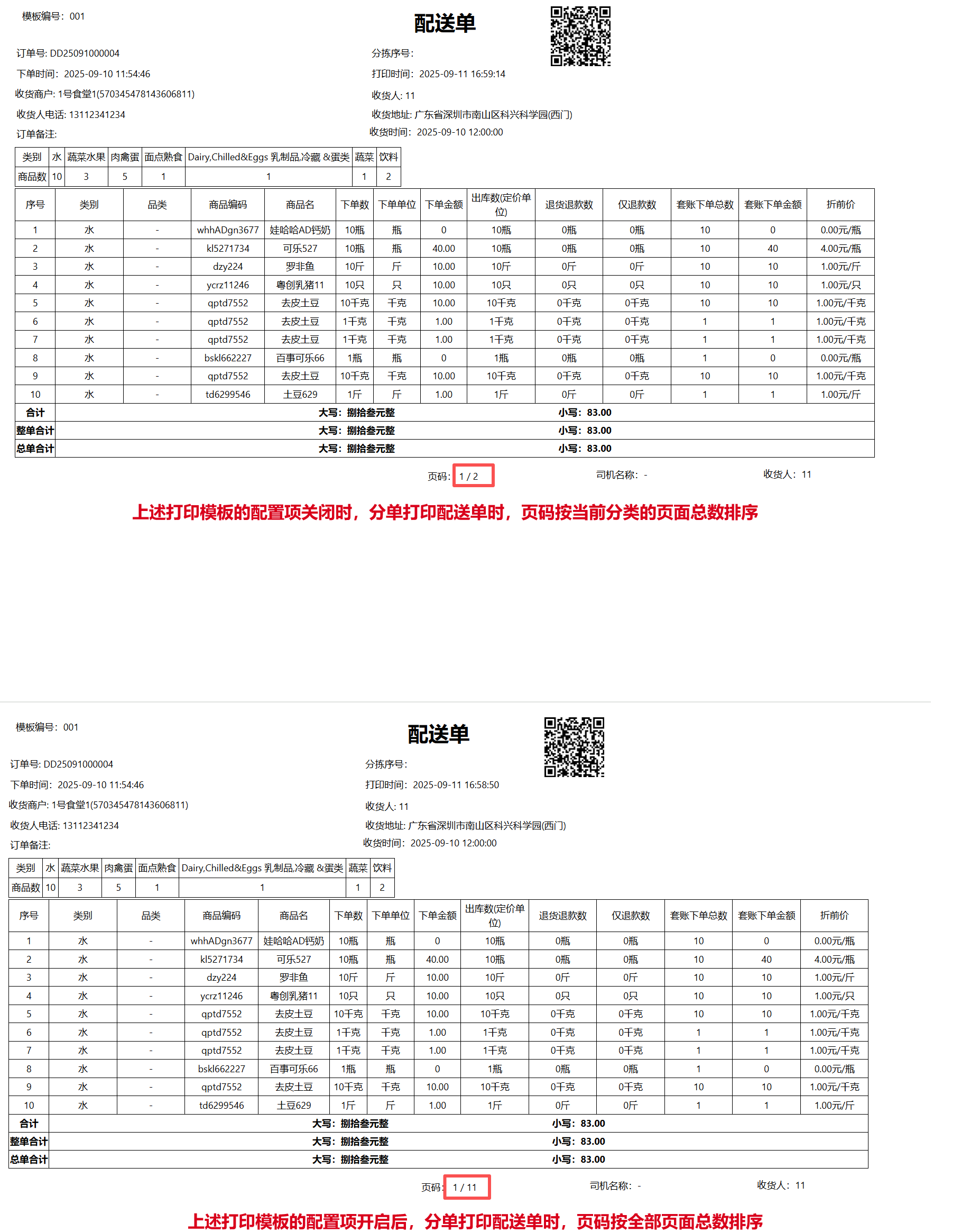 满足不同需求,分单打印配送单时,有些客户希望看到整批配送单总页数;有些客户想单独看某类商品对应页数。
