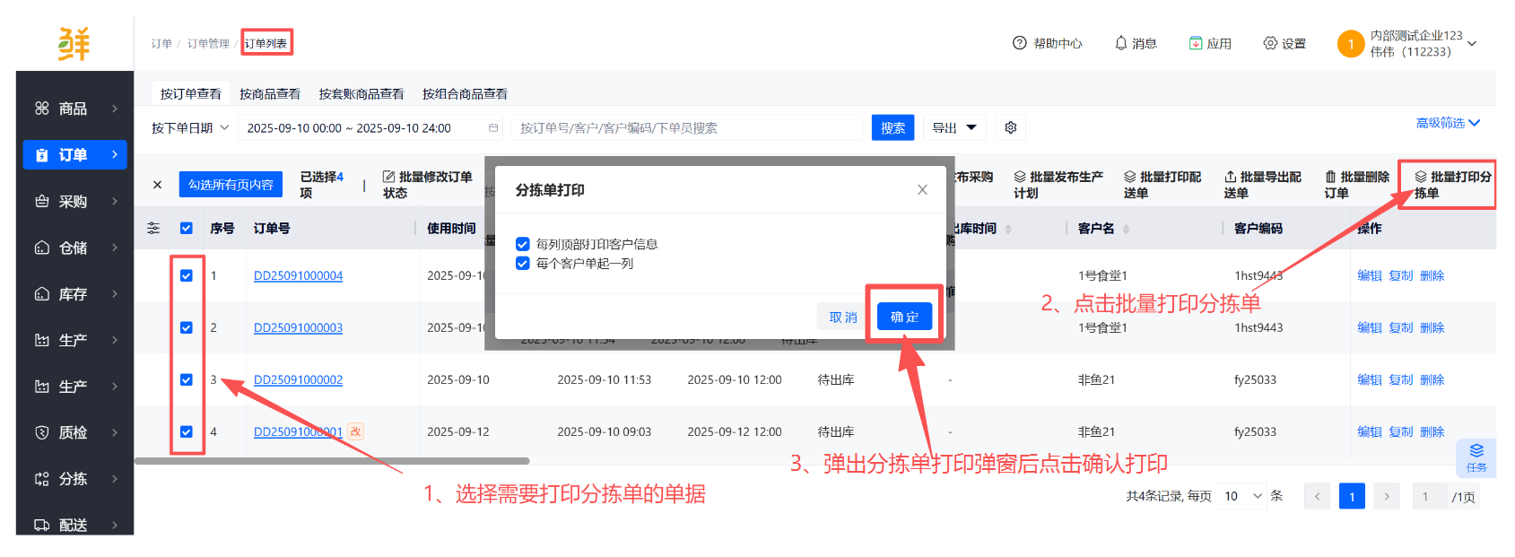 在订单列表页支持打印分拣单,分拣单清晰列示订单商品、数量等信息,方便与实物核对,确保订单准确性。