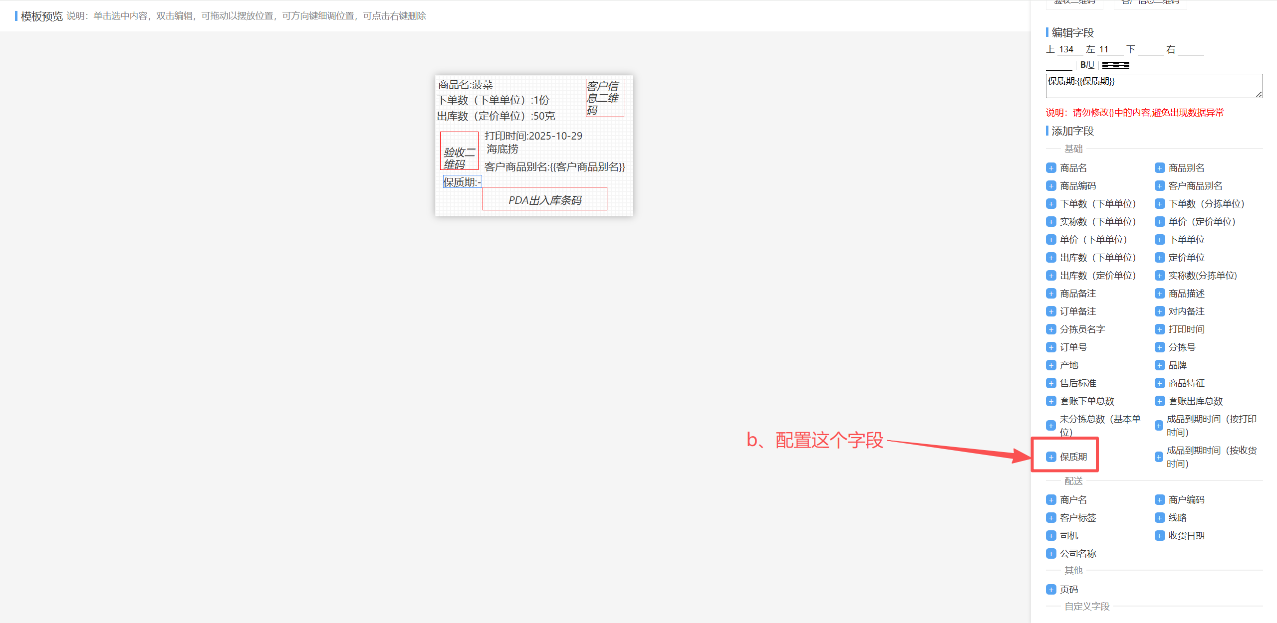 1、配置分拣标签打印模板 —— 分拣标签模板增加保质期字段