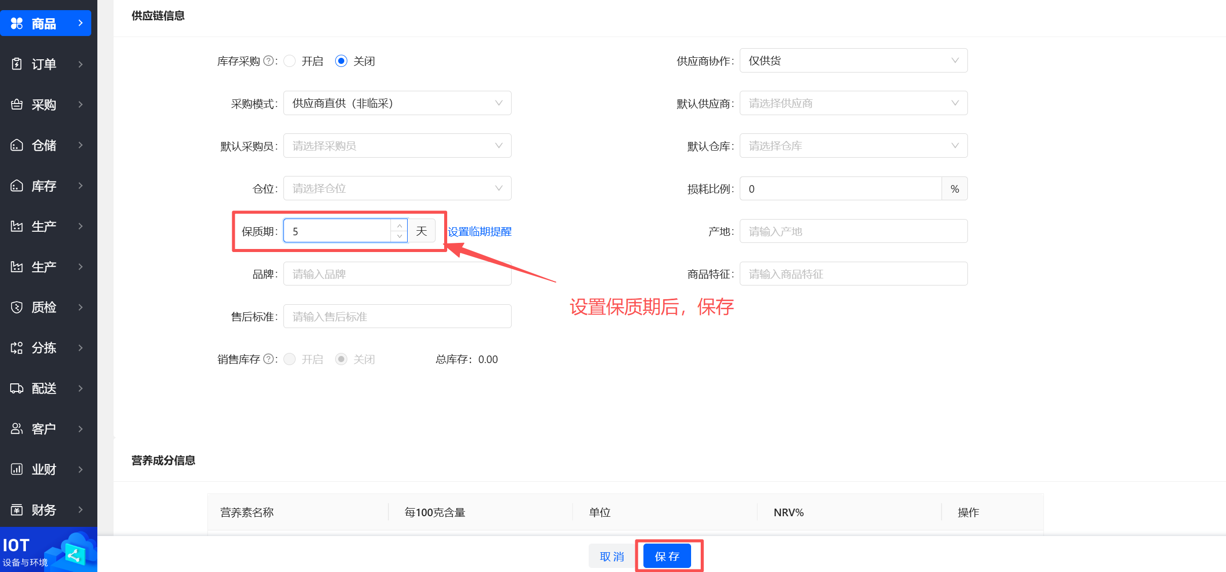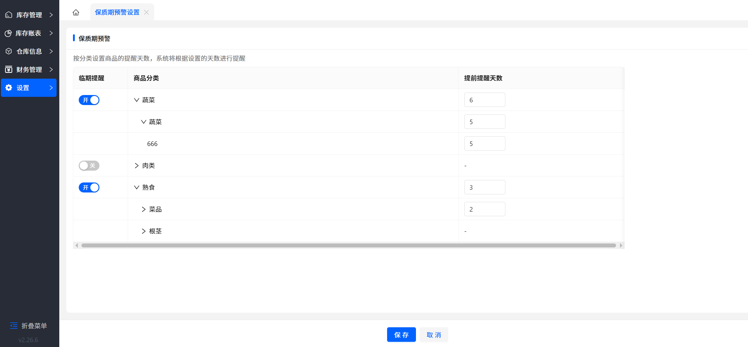 在该页面开启临期提醒,可根据商品的类型,设置提前提醒天数。