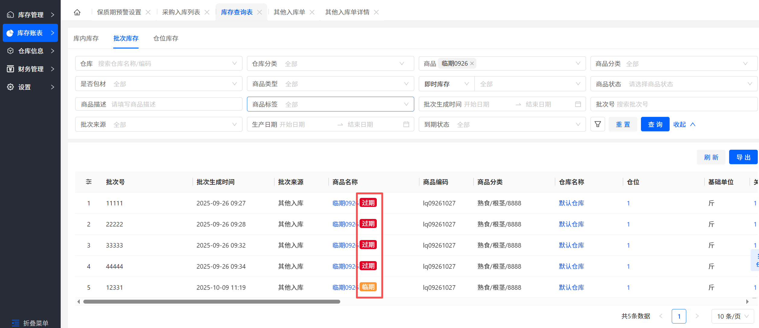 3、设置完成后,相应商品会根据商品分类的提前提醒天数以及商品的生产日期,出现临期、过期标识