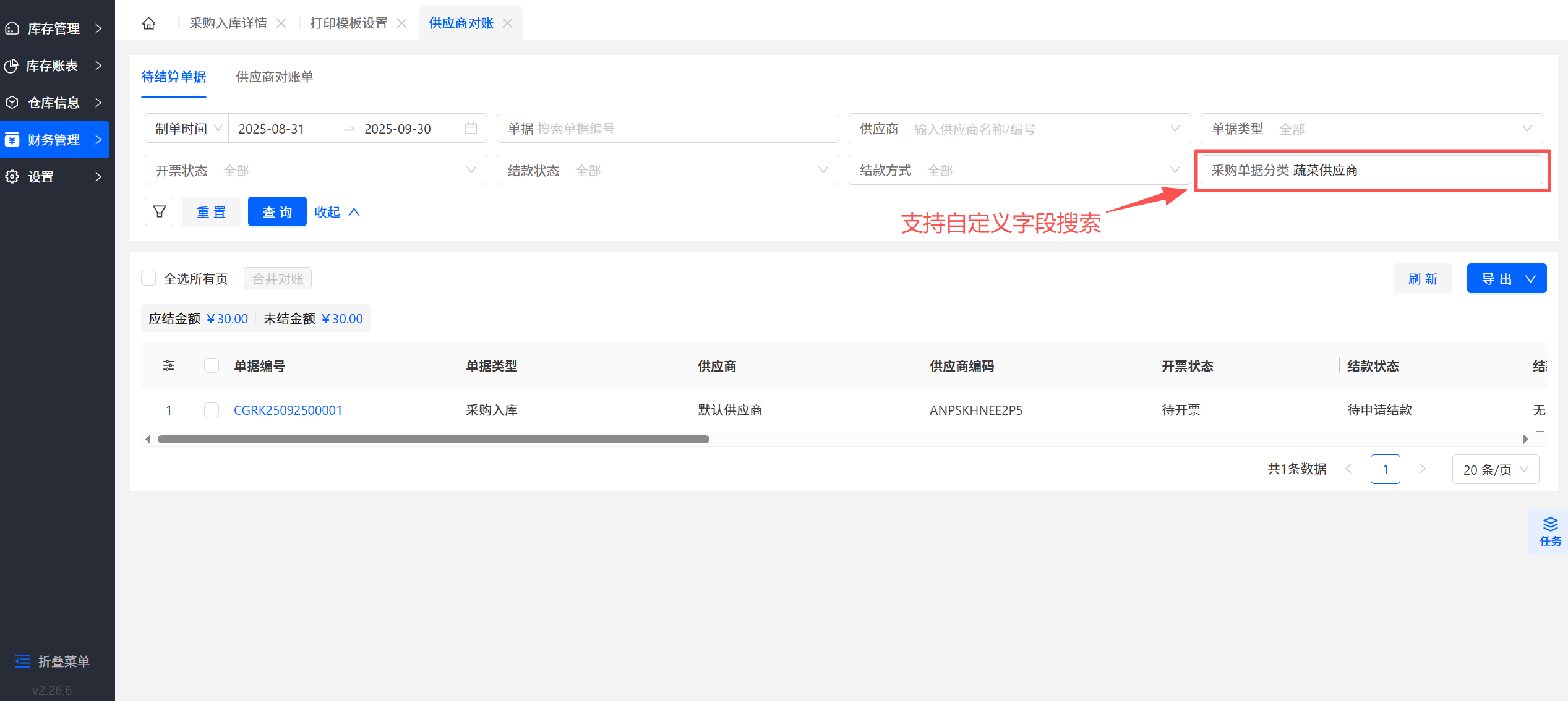3、采购入库单审核完成后,会生成一张待结算单据,该单据会带出采购入库单的自定义字段的值。可在待结算单据页面,利用自定义字段搜索到对应的待结算单据