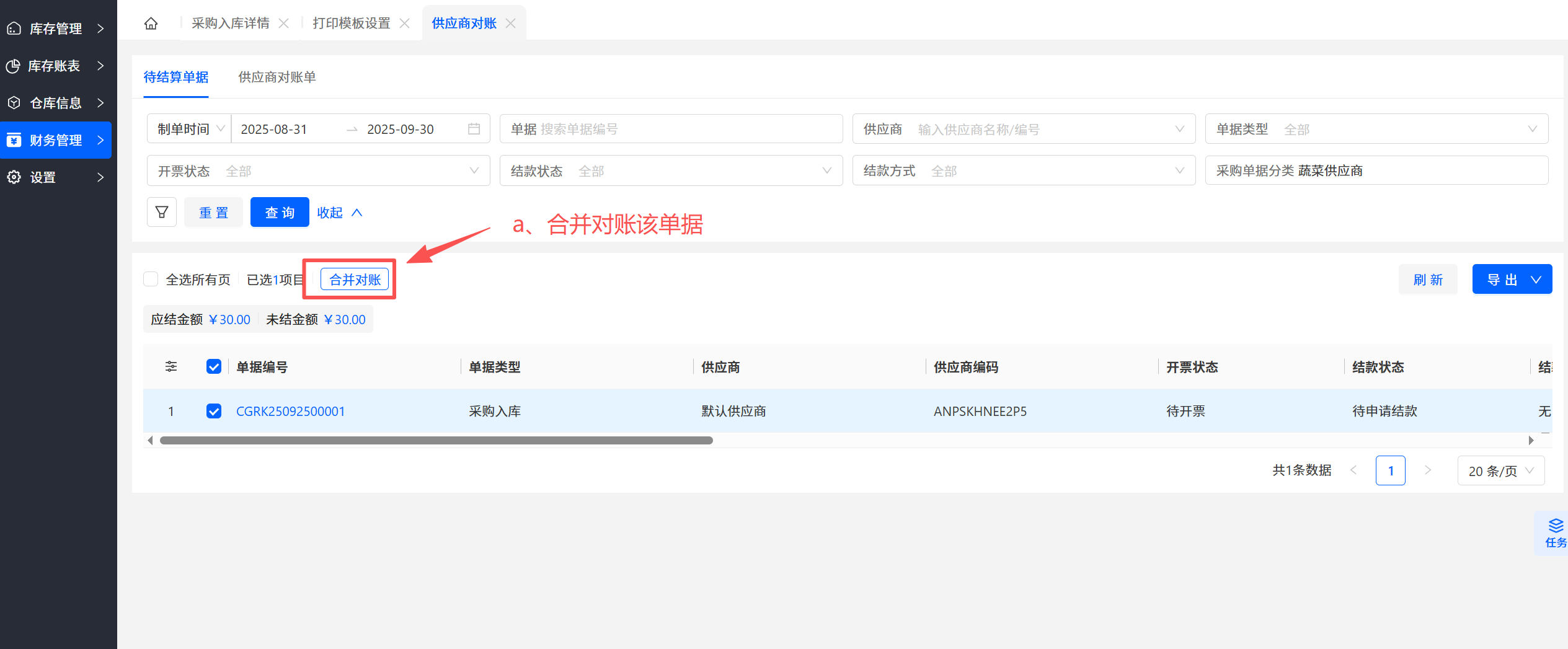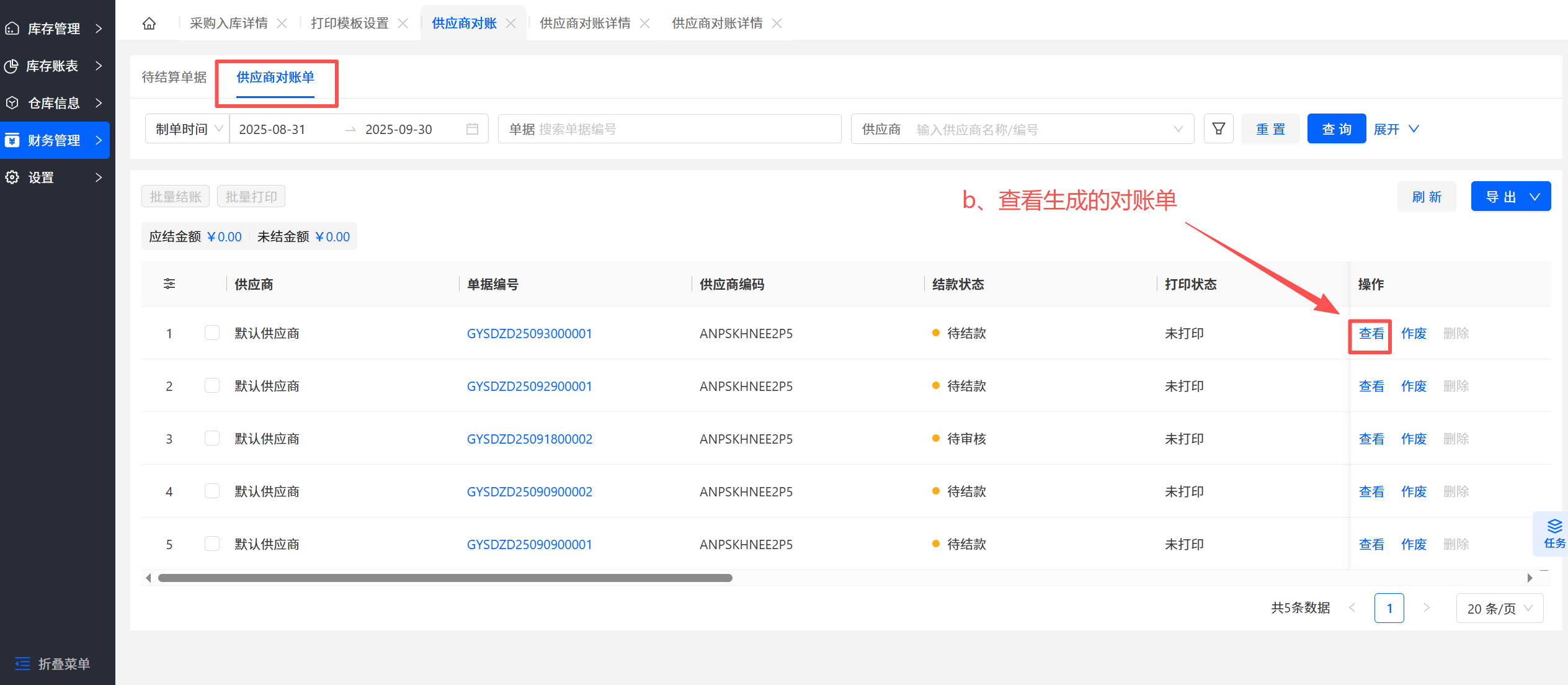 【WMS】财务管理->对账单->供应商对账->待结算单据