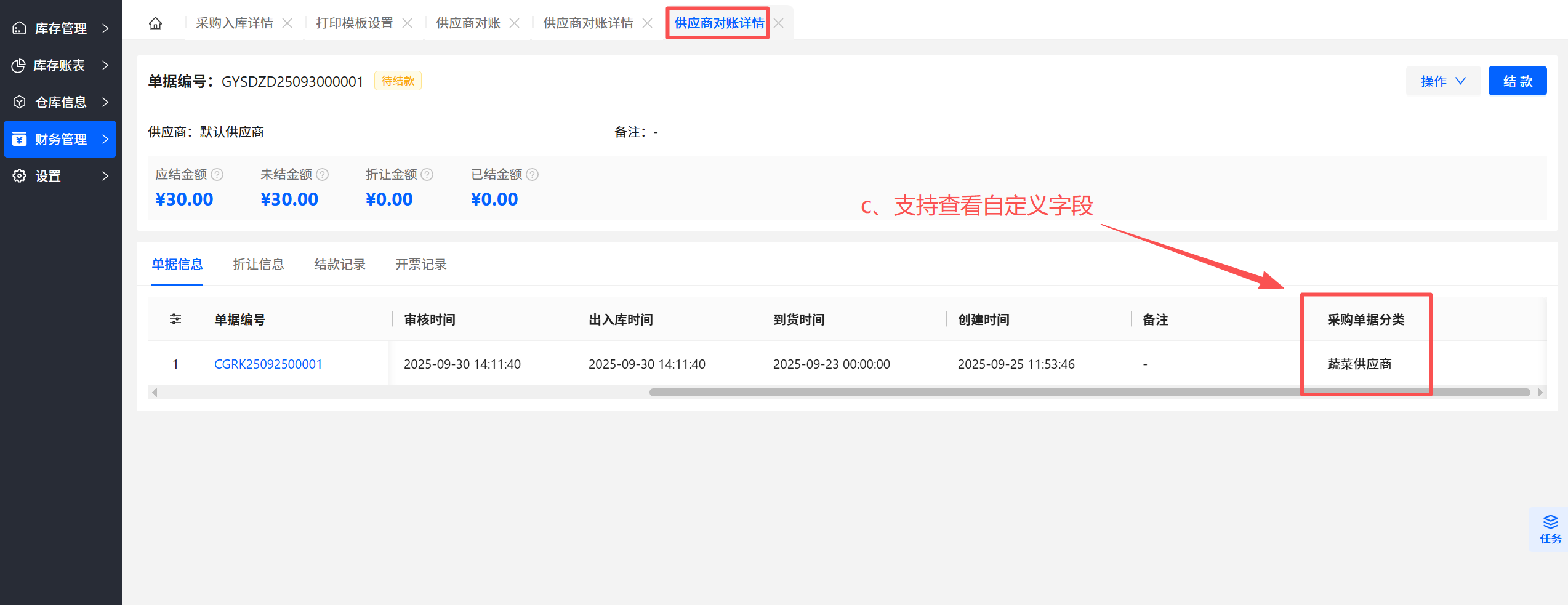 4、待结算单据对账后,在供应商对账单需求,也可查看到该自定义字段